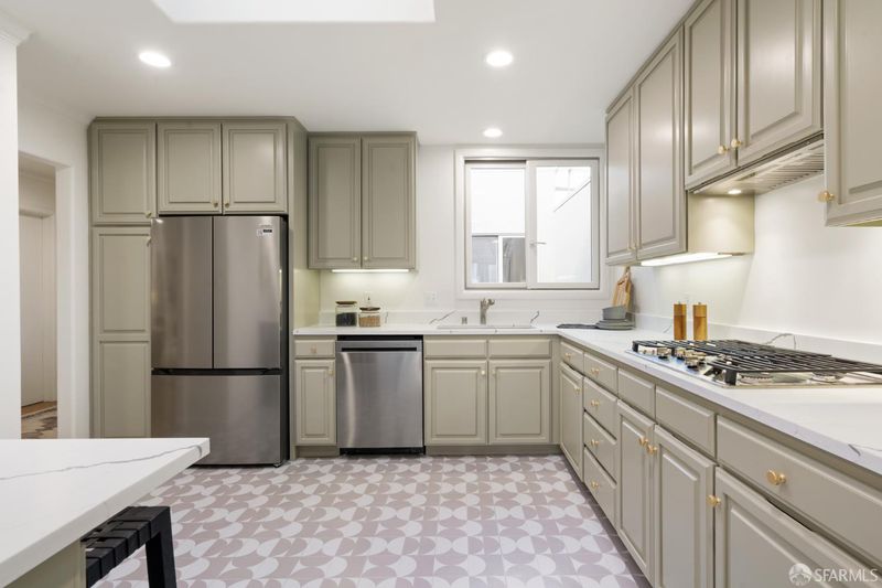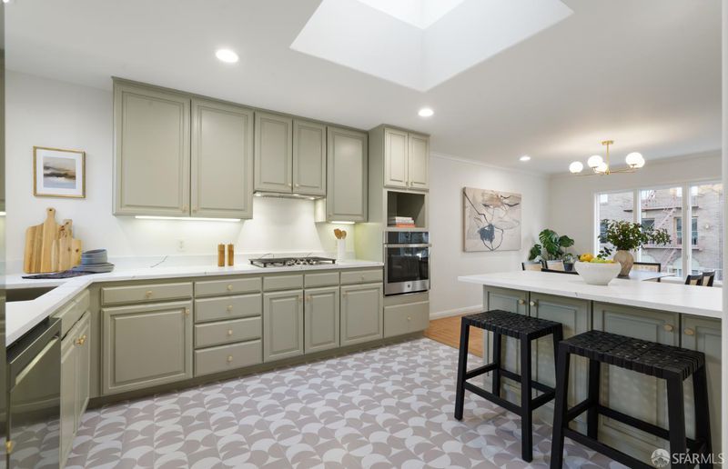 Light filled, top floor, three bedroom, two bathroom, full floor Pacific Heights condominium in a small two-unit association. Special features include multiple skylights, oversized dual pane windows, gorgeous refinished hardwood floors and stunning outlooks. The entry foyer opens to the oversized living room with a wall of windows and handsome wood-burning fireplace. The adjacent dining room opens to the newly renovated kitchen with quartz counters and a central breakfast peninsula. New stainless appliances including gas cooktop and vent hood, French 3-door refrigerator, dishwasher and wall oven. The three bedrooms are all positioned away from the street, including two bedrooms with peaceful garden outlooks. The primary suite offers an en suite bathroom and opens to the private rear deck overlooking a verdant garden. A second full bedroom is conveniently located off the hallway and also opens to the deck. A third bedroom and second full bath complete this wonderful home. The spacious rear deck has expansive outlooks. One car garage parking, deeded storage and laundry. This special Pacific Heights home is just two blocks from Lafayette Park and is convenient to prime shopping along Union and Polk Streets. The home features a 99 Walk Score and exceptional access to public transit and major commuting routes.