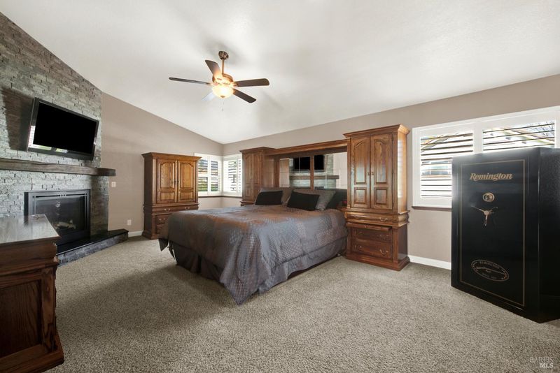 This custom home sits on a desirable corner lot, showcasing, immaculate pride of ownership, both inside and out. The property features an oversized finished 3-car garage and beautifully manicured landscaping that creates a striking first impression and exceptional curb appeal. Step inside to find soaring vaulted ceilings complemented by rich natural wood crown molding and custom cabinetry throughout. The interior blends timeless finishes with tile and hardwood flooring, plantation shutters, and a stunning custom masonry gas fireplace that anchors the living space. The kitchen is thoughtfully designed with granite tile countertops, a built-in double oven, and an abundance of cabinetry. All bedrooms are generously sized, including a convenient downstairs bedroom and full bathroom, ideal for guests or multigenerational living. The expansive primary suite serves as a private retreat, complete with its own gas fireplace framed by stonework, a spa inspired bathroom featuring an oversized tile shower and soaking tub, and a spacious walk-in closet. Enjoy outdoor living in the private backyard, highlighted by stone retaining walls, a Pebble Tec, pool and spa, a covered seating area, and multiple custom built storage sheds, perfect for both relaxation and organization. Conveniently located near parks, schools, downtown, and shopping, this home offers the perfect balance of comfort, functionality, and accessibility.