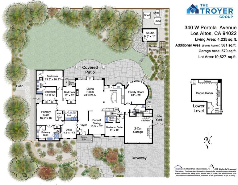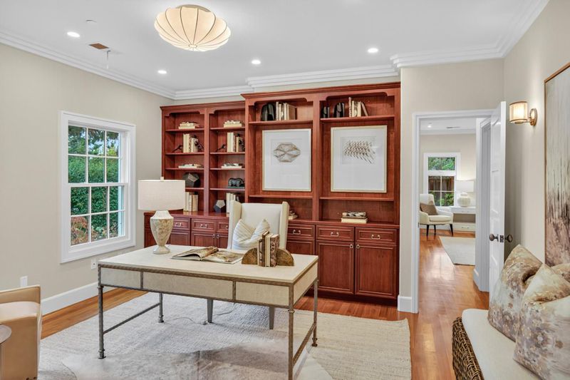 Nestled in one of North Los Altos most prestigious neighborhoods, this luxury home sits on nearly half an acre of private, park-like grounds. Designed for elegance and modern comfort, it offers 5 bedrooms and 4.5 bathrooms across 4,235 sq ft of living space, plus a 581 sq ft finished lower level - a perfect blend of craftsmanship, sophistication, and warmth. The great room features soaring ceilings and French doors to a covered outdoor living area, creating seamless indoor-outdoor flow. The chef's kitchen is a masterpiece with granite countertops, high-end appliances, and custom cabinetry, while formal dining and media rooms make entertaining effortless. The primary suite is a peaceful retreat with a marble spa bath and private patio. Four additional bedrooms, a custom home office, and a flexible lower level provides ideal space for family, work, and recreation. Outside, enjoy a lush backyard oasis with towering redwoods, a level lawn, expansive patios, and a detached studio perfect for yoga, art, or a quiet escape. Moments from downtown Los Altos, shops, dining, and top-rated schools, this home defines California luxury living.