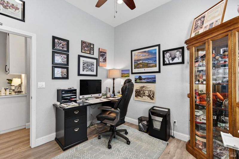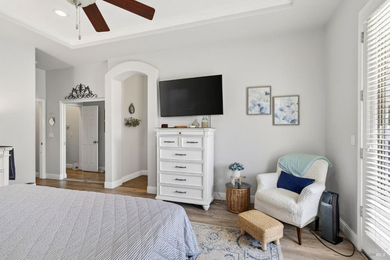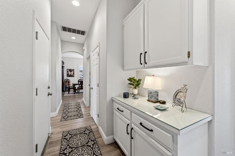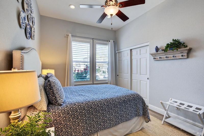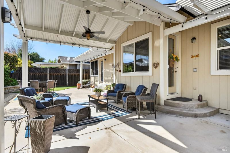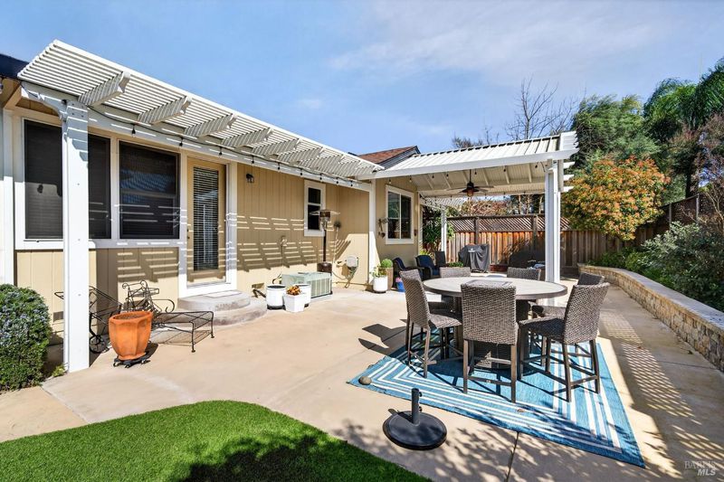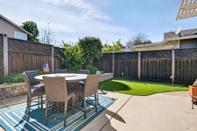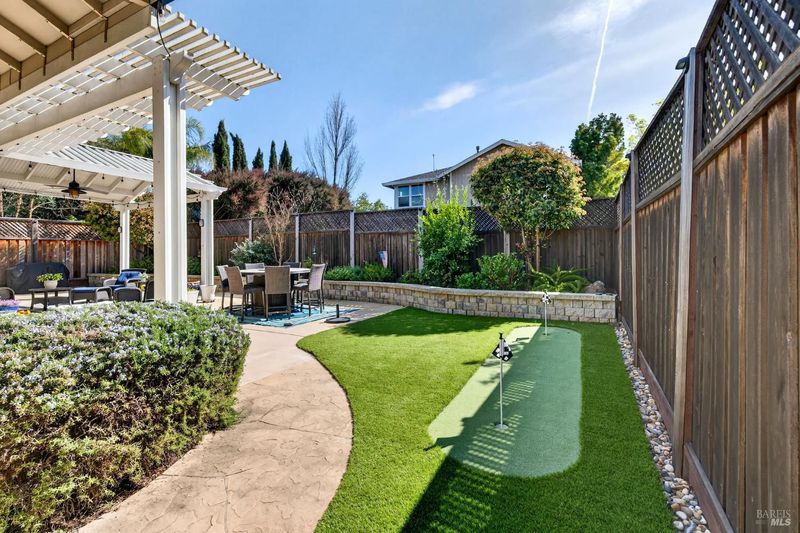Beautifully landscaped front and back, this inviting single story home offers comfortable living with many thoughtful updates throughout. The updated kitchen features new cabinets, quartz countertops, and an island with sink, along with a built-in breakfast area perfect for casual dining. The home offers both a cozy family room with fireplace and a spacious living room with a formal dining area, providing plenty of room for relaxing or entertaining. High ceilings, recessed lighting, plantation shutters, and blinds add style and comfort throughout the home. There are three bedrooms and two updated bathrooms. The primary bedroom features a large walk-in closet, sitting area, and a private door leading out to the patio. The primary bathroom includes douple sinks and large walk-in shower with dual shower heads. The guest bathroom features double sinks and a shower over the tub. Step outside to enjoy the large concrete patio with an expansive aluminum patio cover, creating a wonderful space for outdoor living. The beautifully landscaped backyard includes patio lighting, a putting green, and a storage shed, offering both charm and functionality. This well-maintained home combines indoor comfort with inviting outdoor spaces, making it perfect for everyday living and entertaining.