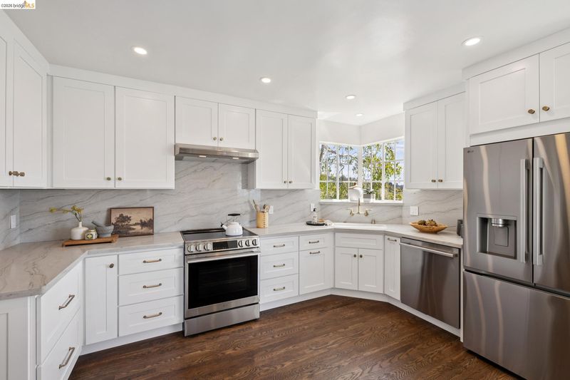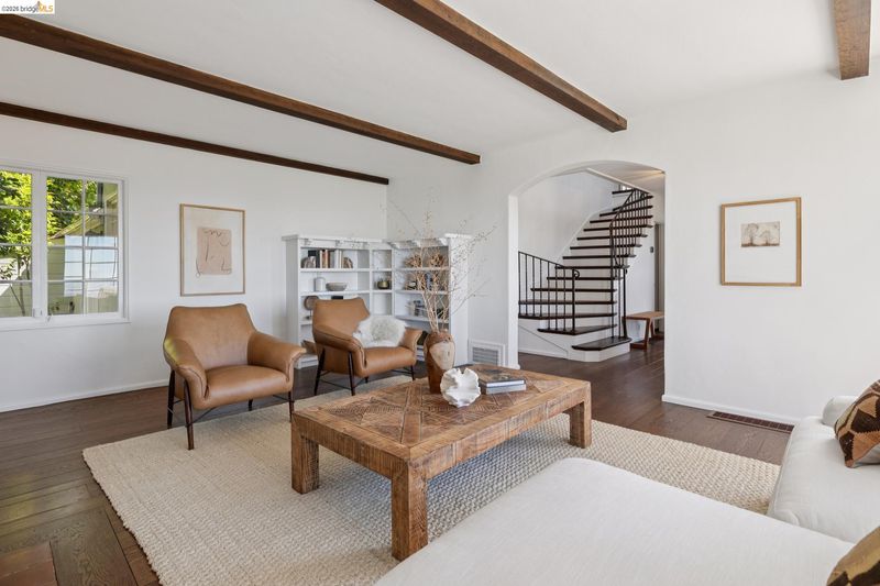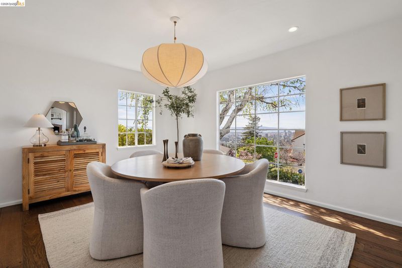 This enchanting storybook traditional, commands sweeping San Francisco Bay views that unfold like a living painting, light, water, and skyline in constant motion. A compelling blend of timeless character and just-completed updates, the home pairs classic architecture with effortless livability. The main level features a striking living room with wood-hewn beams and rustic wood burning fireplace, a striking dining room oriented to capture the mesmerizing views, and a perfectly placed bedroom and full bath. Interior access to the attached two-car garage adds everyday ease. The newly renovated eat-in kitchen is a true centerpiece, with crisp new cabinetry, updated countertops, a new state-of-the-art induction range, and elevated designer finishes, overlooking a sunlit, level lawn, ideal for play or relaxation. Upstairs features three spacious bedrooms and two beautifully updated baths, with two bedrooms featuring versatile adjoining spaces and a primary set apart for a quiet retreat. A truly special offering, moments from Piedmont’s renowned schools, parks, and the soon-to-open community pool.
